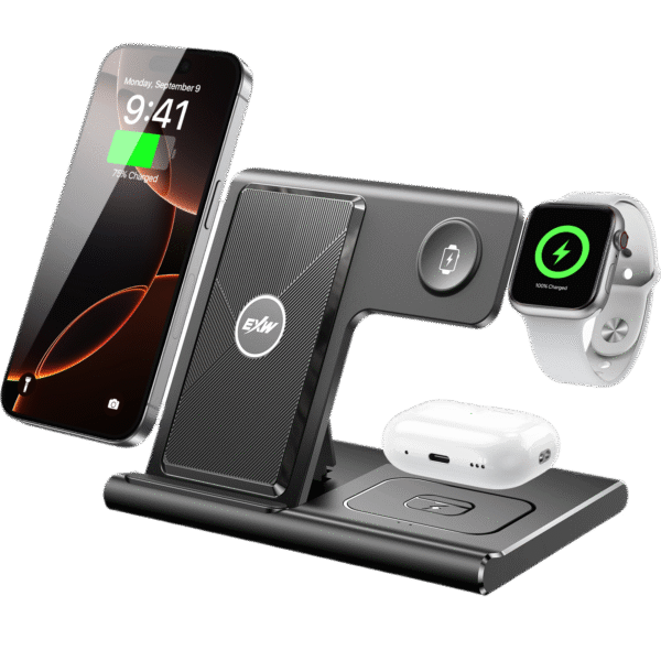 - Charge Three Devices at Once – Compatible with iPhone, Apple Watch, and AirPods simultaneously.